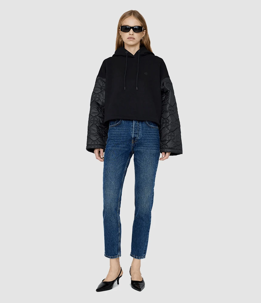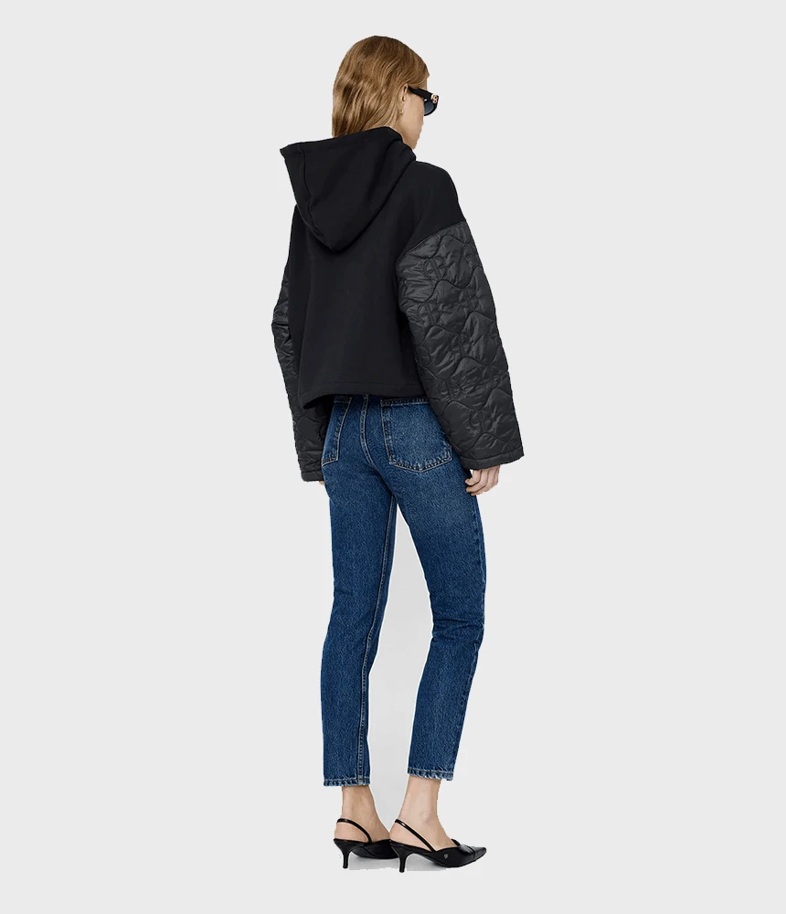 The Anine Bing Ardon Hoodie Monogram in Black will be your new favourite on-the-go hoodie. Featuring monogrammed quilted sleeves and w 100% organic cotton fleece lining at the centre. This unique pullover is complete with drawstrings at the waist and armholes for an adjustable fit and a tonal Anine Bing monogram screen printed at the wearer’s left chest.