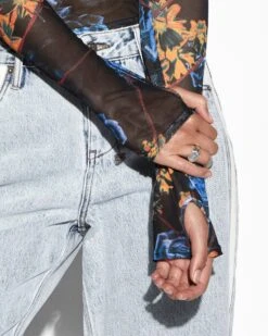The Transfer Ls Top Cyberflora by Ksubi is a fitted mesh long sleeve top designed with a detachable bandeau lining and a custom metal t-box button on the shoulder. Made from premium soft stretch mesh with an exclusive cyberfloral print, this top has cutout details on the front and back with signature Ksubi branding. Easily remove the right hand sleeve for a one shoulder look.