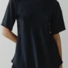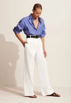 The Matteau Classic Stripe Shirt in Lapis. A classic man-style cotton shirt with a single front pocket in a timeless stripe. Relaxed fit with front and back curved hem. 100% Organic Cotton.