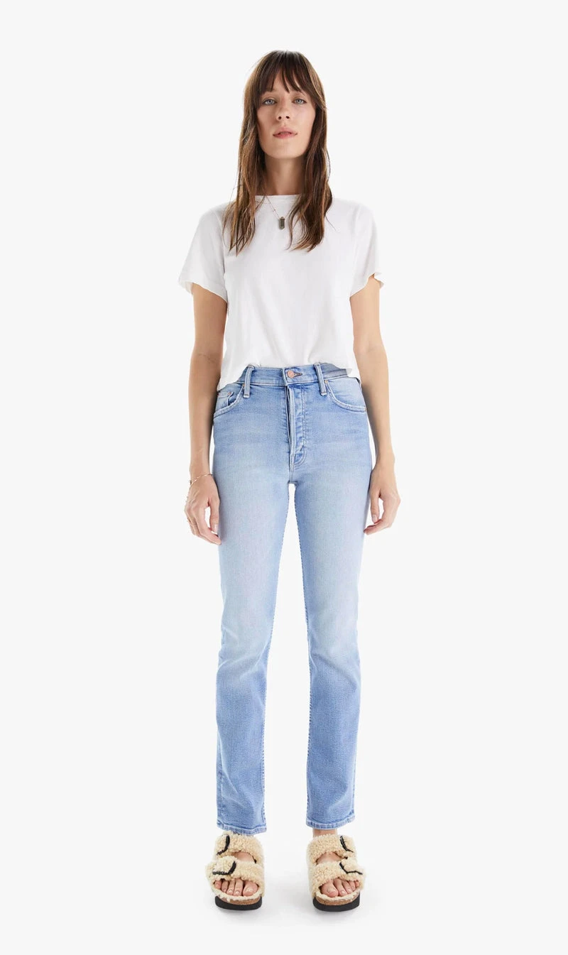 The Mother Denim The Tomcat Skimp in California Cruiser. Our bestselling high-rise straight leg with a button fly, 31-inch inseam and clean hem. Cut from stretch denim, California Cruiser is a light blue wash with fading and whiskering. The button-fly jeans pair well with sun-streaked hair, convertibles and Highway 1.