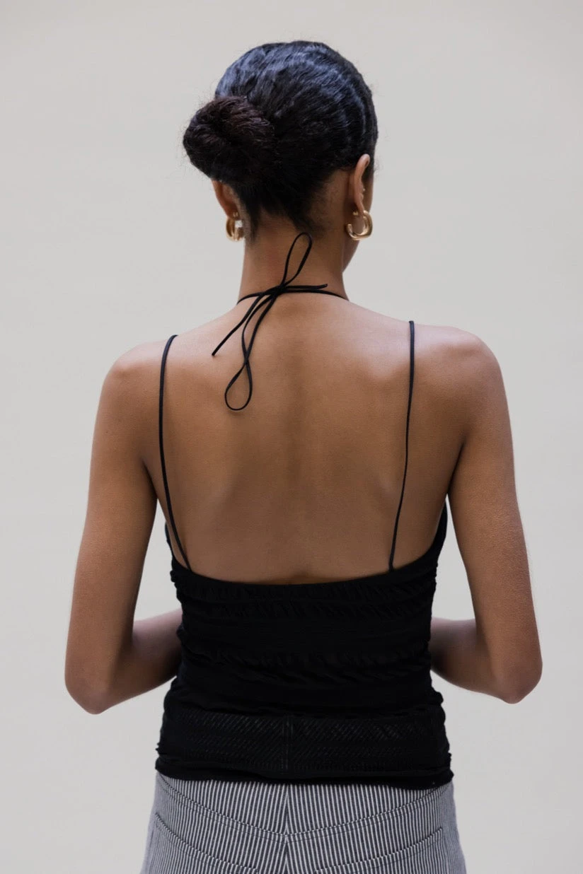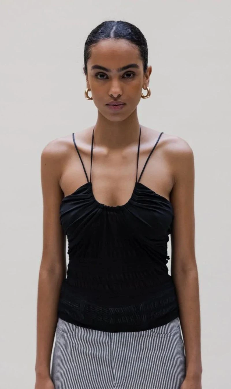 The Musier Paris Tinos Top in Black is a double strapped top, adjustable gathered jersey chest, soft, supple and waffle tulle body.