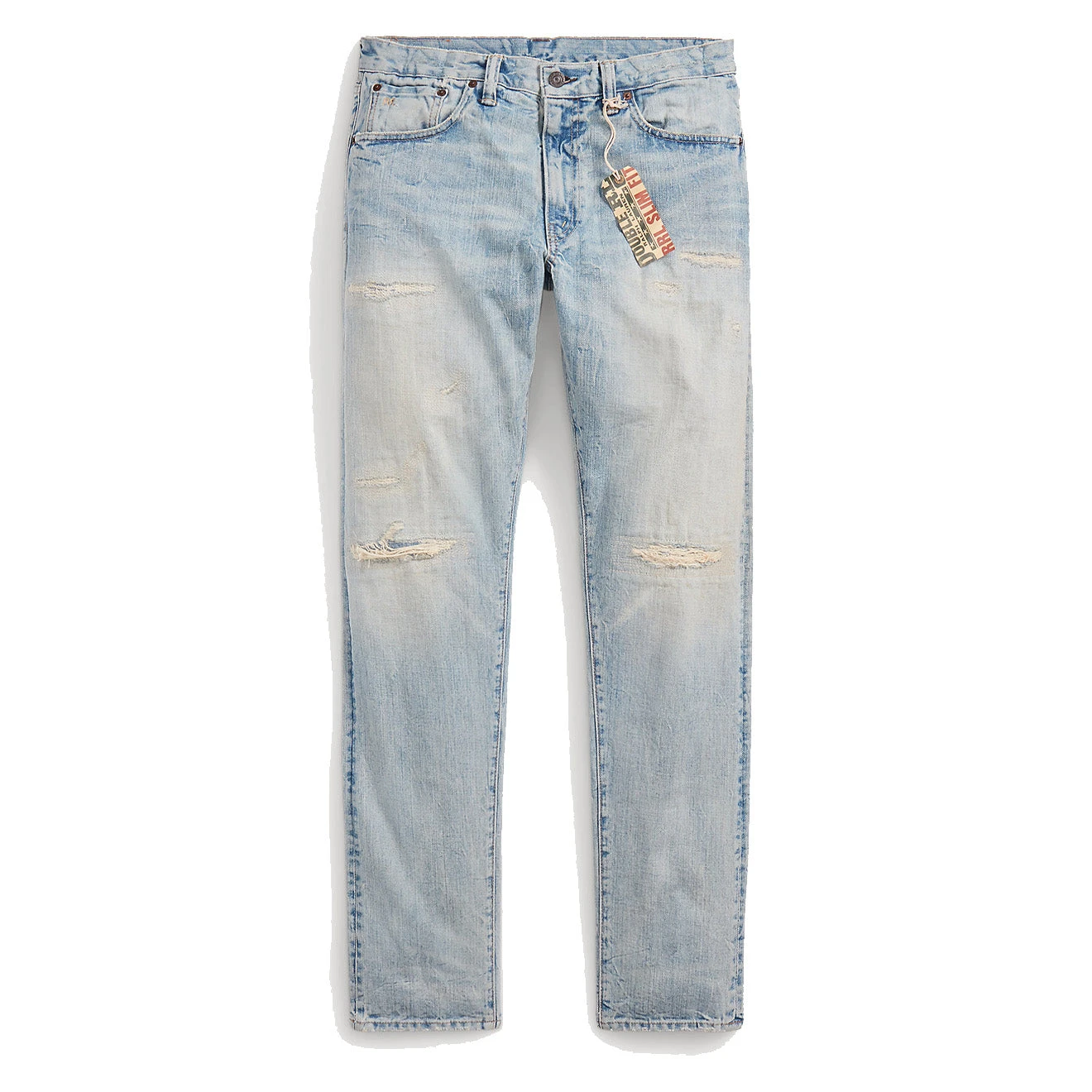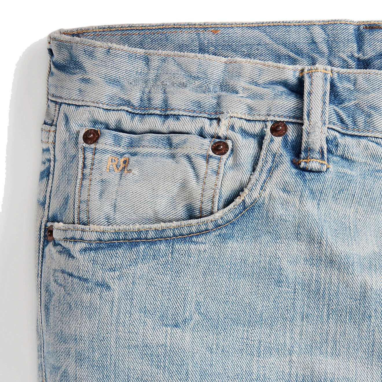 - Hand-set, chain-stitched waistband. Zip fly with a signature buttoned closure. American-made buttons, rivets and washer burrs. Five-pocket styling. “RRL” embroidery on the coin pocket. Natural twill pocket lining.